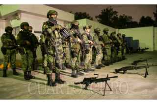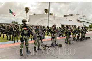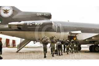 NUEVO LAREDO, TAMAULIPAS. 25JULIO2024.- Los efectivos castrenses arribaron al Aeropuerto Internacional de Nuevo Laredo, en una aeronave de la Guardia Nacional, con la misión de colaborar estrechamente con las autoridades locales para disminuir las actividades ilícitas de los grupos delictivos con presencia en citado municipio, mediante acciones conjuntas que permitan garantizar la libertad, el orden y la paz pública. Las unidades de Fuerzas Especiales se caracterizan por su rapidez, movilidad y capacidad de despliegue y reacción que les permite generar y explotar con eficacia productos de inteligencia, contando con gran variedad de armamento, material, equipo, aeronaves y adiestramiento especializado para operar en cualquier ambiente geográfico. FOTO: SEDENA/CUARTOSCURO.COM