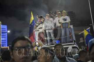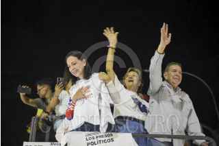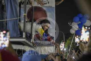 CARACAS, VENEZUELA, 25JULIO2024.- Edmundo González Urrutia, candidato a la presidencia por la Plataforma Unitaria Democrática (PUD) y Maria Corina Machado, líder opositora al gobierno en turno, saludan a sus simpatizantes durante el cierre de campaña de su campaña presidencial. Ante miles de asistentes ambos líderes de la oposición al gobierno de Nicolás Maduro, se pasearon en la avenida principal de las Mercedes,. FOTO: ISRAEL FUGUEMANN /CUARTOSCURO.COM