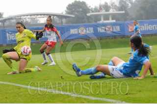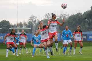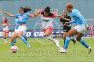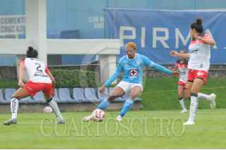 CIUDAD DE MÉXICO, 28JULIO2024.- La capitana de Cruz Azul, Dalia Molina, es perseguida por la defensa atlista. FOTO: DANIEL AUGUSTO / CUARTOSCURO.COM