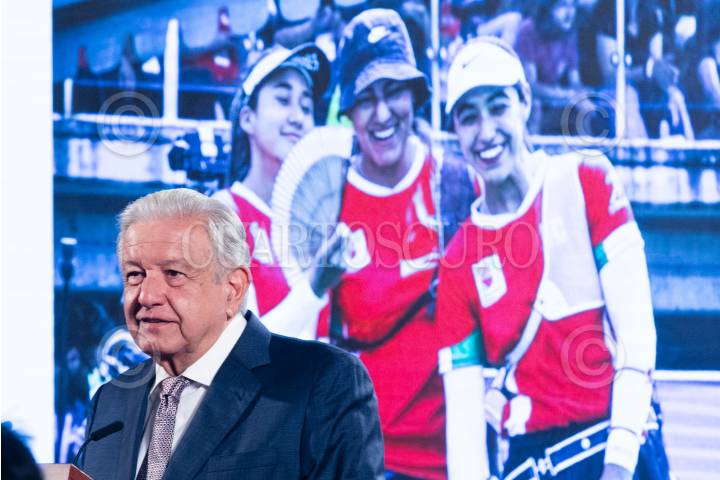 CIUDAD DE MÉXICO, 29JULIO2024.- Andrés Manuel López Obrador, Presidente de México, mando felicitaciones al equipo de arco que ganó la medalla de bronce en las olimpiadas de París, durante la mañanera. FOTO: MOISÉS PABLO/CUARTOSCURO.COM