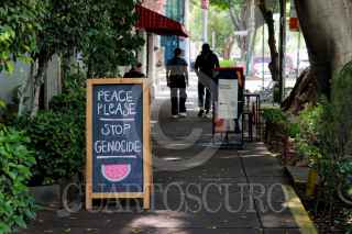 CIUDAD DE MÉXICO, 29JUL2024.- Un cartel con la leyenda de rechazo "Peace Please Stop Genocide" y el dibujo de una sandía, en referencia al genocidio en Palestina, se encuentra en la avenida Álvaro Obregón. FOTO: ALICE MORITZ/CUARTOSCURO.COM