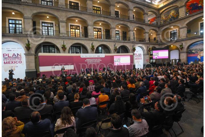 TOLUCA, ESTADO DE MÉXICO, 30JULIO2024.- Delfina Gómez Álvarez, Gobernadora del Estado de México presentó el Plan de Desarrollo del Estado de México 2023-2029, estructurado sobre 7 ejes, a cuatro se les denominó “Ejes del Cambio” y a tres “Ejes Transversales”, el Plan de Desarrollo surge de los Foros de Consulta Popular así como las Audiencias Ciudadanas. FOTO: CRISANTA ESPINOSA AGUILAR /CUARTOSCURO.COM