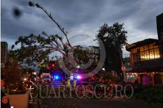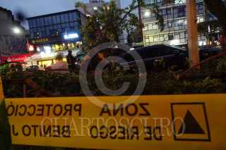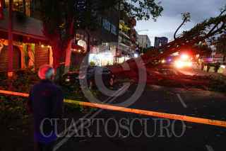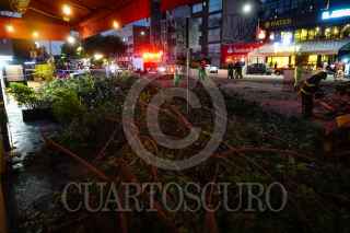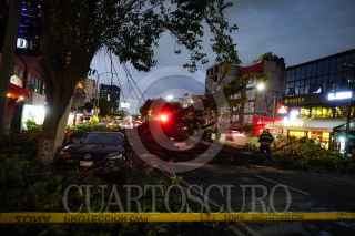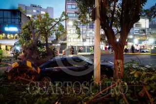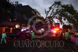 CIUDAD DE MÉXICO, 01AGOSTO2024.- Debido a los fuertes vientos un enorme árbol de aproximadamente diez metros cayó sobre un auto negro, el cuál iba tripulado pero no resultaron heridos, en avenida Universidad a la altura de la calle Pitágoras, en la colonia Del Valle. Bomberos trabajaron al menos dos horas para seccionarlo y así poder abrir la circulación. FOTO: ROGELIO MORALES/CUARTOSCURO.COM