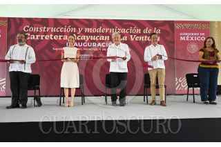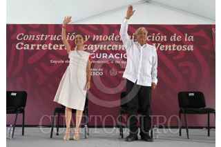 SAYULA DE ALEMÁN, 04AGOSTO2024.- Jorge Nuño Lara, Secretario de Infraestructura, Comunicaciones y Transportes; Claudia Sheinbaum Pardo, Presidenta Electa de México; Andrés Manuel López Obrador, Presidente Constitucional de México; Rocío Nahle, gobernadora electa de Veracruz, y Cuitláhuac García, gobernador constitucional de Veracruz, encabezaron la inauguración de la carretera Acayucan-La Ventosa, en Unidad Deportiva Sayula de Alemán. FOTO: PRESIDENCIA/CUARTOSCURO.COM