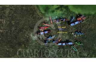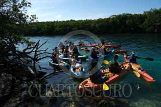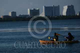CANCÚN, QUINTANA ROO, 04AGOSTO2024.- Activistas medioambientales a bordo de kayaks desplegaron el mensaje “No más plásticos” en la Laguna de Nichupté, con la silueta de un cocodrilo, especie local que vive en este ecosistema y que se puede ver amenazada por la contaminación plástica. En la acción participaron integrantes de Semillas Fuertes, Blue Religion, Exatec, Highlife México, Canoa Maya, Conexión Nativa Cancún, Greenpeace México y voluntarios a título individual a bordo de canoas y kayaks. A unos metros del lugar, activistas de Greenpeace México recolectaron firmas para una iniciativa ciudadana, la cual busca que el Congreso reforme la Ley General de Residuos con la prohibición de los plásticos de un solo uso y asigne responsabilidades a las empresas contaminantes. FOTO: PRENSA GREENPEACE/CUARTOSCURO.COM