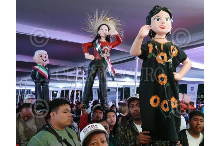 CIUDAD DE MÉXICO, 06AGOSTO2024.- Simpatizantes mostraron su apoyo con esculturas de cartón de Andrés Manuel López Obrador, presidente de México; Claudia Sheinbaum, virtual presidenta electa, y Clara Brugada, Jefa de Gobierno electa, durante una Asamblea en la Utopía Meyehualco, en la alcaldía Iztapalapa. FOTO: GRACIELA LÓPEZ /CUARTOSCURO.COM