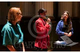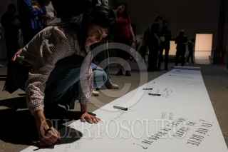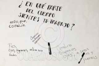 CIUDAD DE MÉXICO, 07AGOSTO2024.- Durante la presentación del proyecto de las artistas Flor Firvida Martin y Simona Deaconescu, titulado “Mujeres en el Trabajo: Encrucijadas, Ritmos y Continuidades”, varias personas pudieron escribir sus pensamientos sobre cuestiones como “¿En qué parte del cuerpo sientes tu trabajo?”. El proyecto explora las realidades laborales de la mujer en la Ciudad de México y Bucarest. FOTO: ALICE MORITZ / CUARTOSCURO.COM