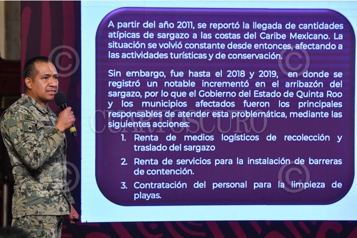 CIUDAD DE MÉXICO, 08AGOSTO2024.- Juan Luis Miraflores, encargado del Seguimiento de la Operaciones de Recolección de Sargazo de la Secretaria de Marina, durante su intervención en la conferencia matutina realizada en Palacio Nacional, expone las medidas que la secretaría ha tomado para la recolección del sargazo en el caribe mexicano. FOTO: MARIO JASSO/CUARTOSCURO.COM