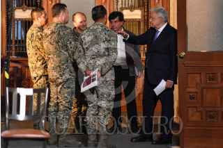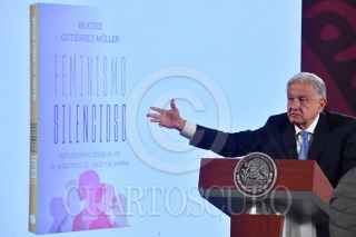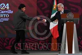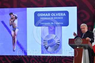 CIUDAD DE MÉXICO, 08AGOSTO2024.- Jesús Ramírez Cuevas, coordinador de coordinador General de Comunicación Social de la Presidencia de la República, le entrega un papel a Andrés Manuel López Obrador, presidente de México, durante la conferencia matutina felicitó a Osmar Olvera quien ganó la medalla de bronce (trampolín de tres metros) en los Juegos Olímpicos París 2024. FOTO: MARIO JASSO/CUARTOSCURO.COM