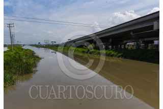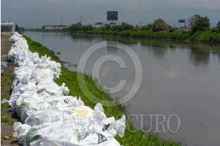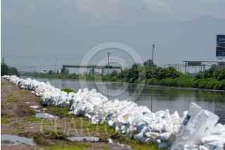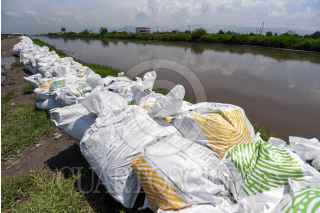 LERMA, ESTADO DE MÉXICO, 08AGOSTO2024.- Instalan costales de arena en las orillas del Río Lerma atrás de la zona industrial del municipio de Lerma, ante el crecimiento del cause de este afluente por las lluvias que se han presentado en los últimos días. FOTO: CRISANTA ESPINOSA AGUILAR /CUARTOSCURO.COM