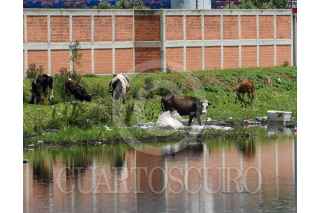 LERMA, ESTADO DE MÉXICO, 09AGOSTO2024.- Algunas vacas pastorean en la parte trasera de la zona industrial de Lerma, tomando agua a la orilla de una pequeña laguna que tiene basura. FOTO: CRISANTA ESPINOSA AGUILAR /CUARTOSCURO.COM