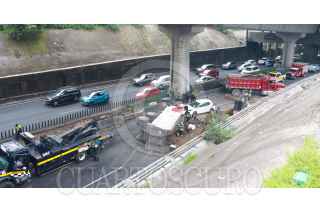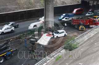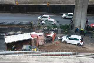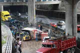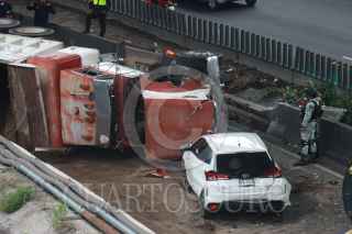 CIUDAD DE MÉXICO, 10AGOSTO2024.- Un tráiler choco contra cinco vehículos en los carriles centrales de Periférico,casi con Reforma, con dirección a la fuente de Petróleos. La pesada unidad que transportaba tierra volcó tras el impacto lo que provocó el cierre de la vialidad para poder incorporarla. FOTO: ROGELIO MORALES/CUARTOSCURO.COM