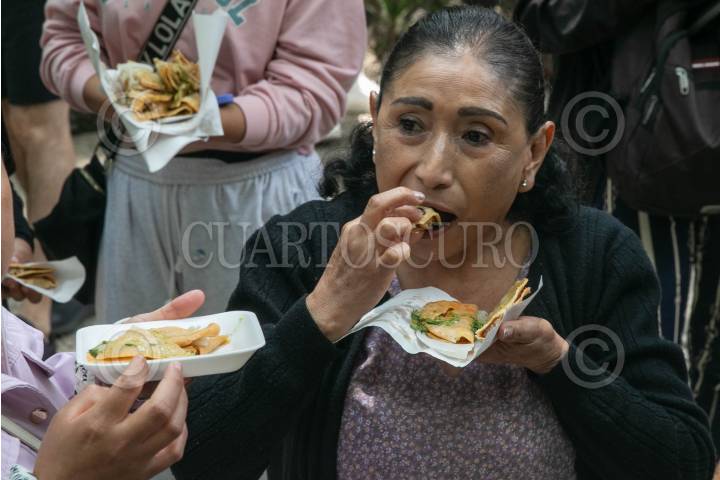 CIUDAD DE MÉXICO, 11AGOSTO2024.- Habitantes de San Vicente Xiloxochitla, Tlaxcala, impusieron un Récord Guinness de repartición de tacos de canasta con más variedades de sabor. Cientos de capitalinos se aglomeraron en Reforma para poder probar este típico alimento capitalino. Cerca de 30,000 mil tacos se agotaron en media hora, los cuales fueron aderezados con la salsa verde, principalmente. La gobernadora Lorena Cuéllar Cisneros recibió el título por esta hazaña, la cual según lo preciso una de las participantes fue impulsada por los productores de los tacos con el objetivo de que la ciudadanía conozca que este manjar culinario es originario de San Vicente Xiloxochitla. FOTO: MOISÉS PABLO/CUARTOSCURO.COM
