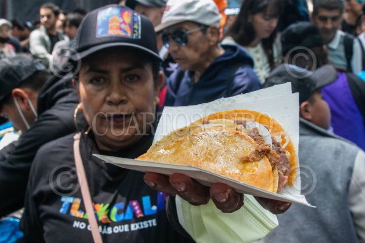 CIUDAD DE MÉXICO, 11AGOSTO2024.- Habitantes de San Vicente Xiloxochitla, Tlaxcala, impusieron un Récord Guinness de repartición de tacos de canasta con más variedades de sabor. Cientos de capitalinos se aglomeraron en Reforma para poder probar este típico alimento capitalino. Cerca de 30,000 mil tacos se agotaron en media hora, los cuales fueron aderezados con la salsa verde, principalmente. La gobernadora Lorena Cuéllar Cisneros recibió el título por esta hazaña, la cual según lo preciso una de las participantes fue impulsada por los productores de los tacos con el objetivo de que la ciudadanía conozca que este manjar culinario es originario de San Vicente Xiloxochitla. FOTO: MOISÉS PABLO/CUARTOSCURO.COM