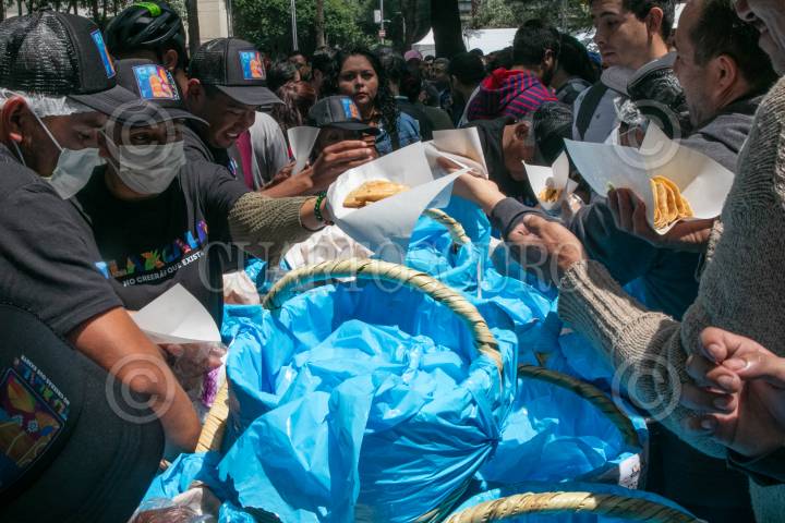 CIUDAD DE MÉXICO, 11AGOSTO2024.- Habitantes de San Vicente Xiloxochitla, Tlaxcala, impusieron un Récord Guinness de repartición de tacos de canasta con más variedades de sabor. Cientos de capitalinos se aglomeraron en Reforma para poder probar este típico alimento capitalino. Cerca de 30,000 mil tacos se agotaron en media hora, los cuales fueron aderezados con la salsa verde, principalmente. La gobernadora Lorena Cuéllar Cisneros recibió el título por esta hazaña, la cual según lo preciso una de las participantes fue impulsada por los productores de los tacos con el objetivo de que la ciudadanía conozca que este manjar culinario es originario de San Vicente Xiloxochitla. FOTO: MOISÉS PABLO/CUARTOSCURO.COM