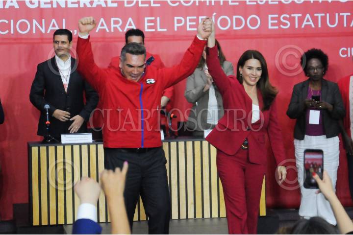 CIUDAD DE MÉXICO 11AGOSTO2024. - Alejandro Moreno y Carolina Viggiano celebran su victoria luego de ser reelegidos como presidente y secretaria general del PRI. FOTO: DANIEL AUGUSTO /CUARTOSCURO.COM