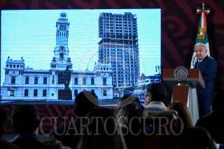CIUDAD DE MÉXICO, 13AGOSTO2024.- Andrés Manuel López Obrador, presidente de México, presentó la imagen de la Torre Centro, edificio de 20 pisos de departamentos de lujo, construido en el malecón de Veracruz, durante la conferencia matutina desde Palacio Nacional. FOTO: GALO CAÑAS/CUARTOSCURO.COM