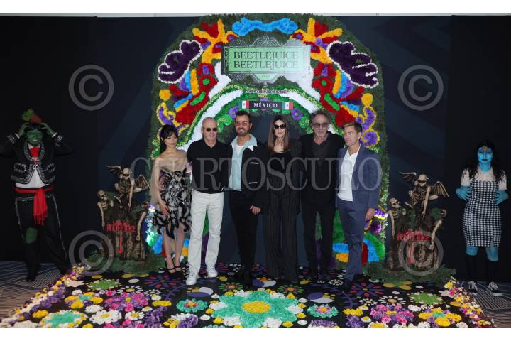 CIUDAD DE MÉXICO, 13AGOSTO2024. Henna Ortega, Michael Keaton, Justina Theroux, Monica Bellucci, Tim Burton y Tony Harper durante el photocall de la película de comedia de terror y fantasía norteamericana “Beetlejuice, Beetlejuice”, en la Ciudad de México. Esta película es una secuela directa de la estrenada en 1988. FOTO: EDGAR NEGRETE LIRA/CUARTOSCURO.COM