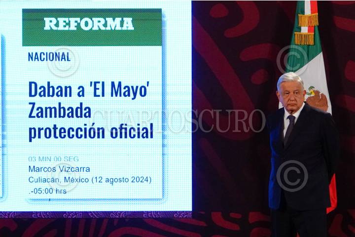 CIUDAD DE MÉXICO, 14AGOSTO2024.- Andrés Manuel López Obrador, presidente de México, exponiendo una nota publicada por el diario Reforma, sobre el tema de la detención del Mayo Zambada, durante la conferencia matutina desde el Salón Tesorería de Palacio Nacional. FOTO: ROGELIO MORALES /CUARTOSCURO.COM