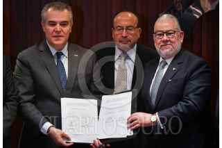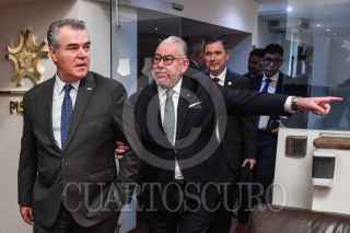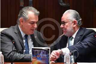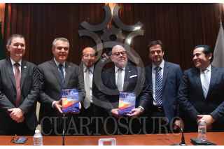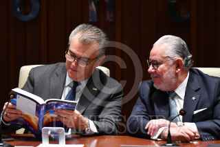 CIUDAD DE MÉXICO, 14AGOSTO2024.- Alejandro Malagón Barragán, presidente de la Confederación de Cámaras Industriales de los Estados Unidos Mexicanos (CONCAMIN) le muestra la hora a Francisco Alberto Cervantes, presidente del Consejo Coordinador Empresarial (CCE), durante la presentación del libro “Hacia una nueva visión del desarrollo digital en México” en el auditorio de CONCAMIN. FOTO: MARIO JASSO/CUARTOSCURO.COM