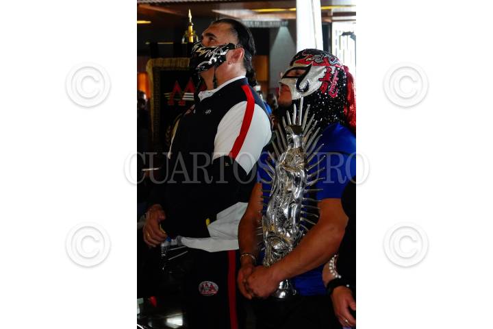 CIUDAD DE MÉXICO, 14AGOSTO2024.- Los luchadores electroshock y Pentagon Jr, durante la misa en la Basílica. FOTO: ROGELIO MORALES /CUARTOSCURO.COM