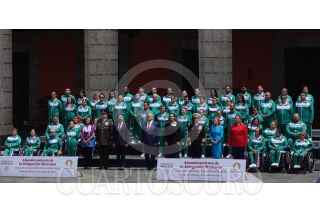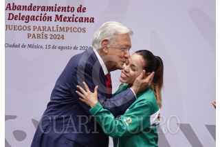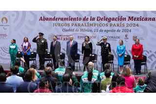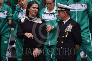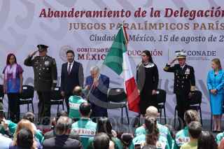 CIUDAD DE MÉXICO, 15AGOSTO2024.- Ana Gabriela Guevara, directora de la CONADE, y Rafael Ojeda, secretario de Marina, conversaron durante el Abanderamiento de la Delegación Mexicana, realizada en el Patio Central de Palacio Nacional. FOTO: GRACIELA LÓPEZ /CUARTOSCURO.COM