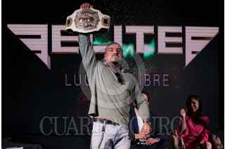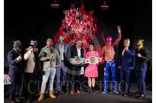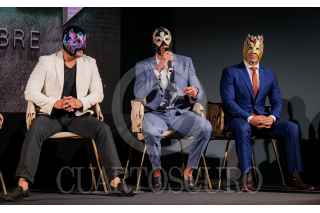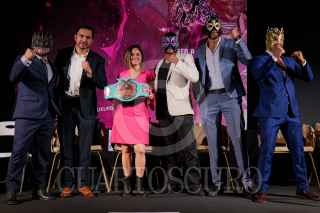 CIUDAD DE MÉXICO, 15AGOSTO2024.- Dios del Inframundo, luchador; Ernesto Santillán, presidente de la Liga Elite; Erika Berumen González, vocera del Parque Aztlán; y los luchadores Argenis, Brazo de Oro Jr y Volador Jr participaron a la conferencia de prensa en la que se dieron a conocer los detalles de los próximos espectáculos de lucha libre organizados por la Liga Lucha Libre Elite. Estos eventos se llevarán a cabo el 7 y 8 de septiembre en el Parque Aztlán. FOTO: ALICE MORITZ/CUARTOSCURO.COM