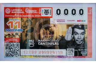 CIUDAD DE MÉXICO, 16AGOSTO2024.- Un hombre vendió billetes de lotería de Mario Moreno “Cantinflas” frente a la Secretaría de Turismo, donde se llevó a cabo la develación de ese mismo boleto. El sorteo se realizará el próximo 25 de agosto. FOTO: ALICE MORITZ/CUARTOSCURO.COM