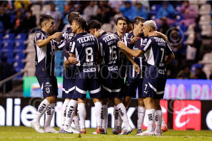 PUEBLA, PUEBLA, 16AGOSTO2024.- Jugadores del club Rayados celebraron una anotación durante el partido entre el Club Puebla y Monterrey, correspondiente a la jornada 16 del torneo Apertura 2024 de la Liga BBVA MX, celebrado en el Estadio Cuauhtémoc, que culminó con un triunfo de 2-1 por parte de los visitantes. FOTO: MIREYA NOVO/ CUARTOSCURO.COM