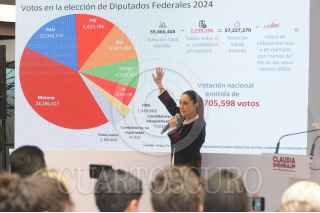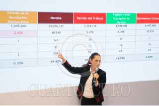 CIUDAD DE MÉXICO, 19AGOSTO2024. - Claudia Sheinbaum, presidenta electa, muestra a la prensa como Morena no tiene una sobrerrepresentación en la Cámara de Diputados. FOTO: DANIEL AUGUSTO /CUARTOSCURO.COM
