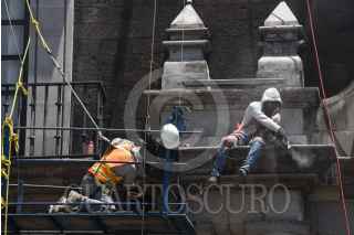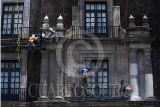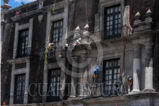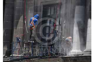 TOLUCA, ESTADO DE MÉXICO, 20AGOSTO2024.- Trabajadores realizan mantenimiento en Palacio de Gobierno en la ciudad de Toluca, utilizando arnés de seguridad para poder pulir las paredes. FOTO: CRISANTA ESPINOSA AGUILAR /CUARTOSCURO.COM