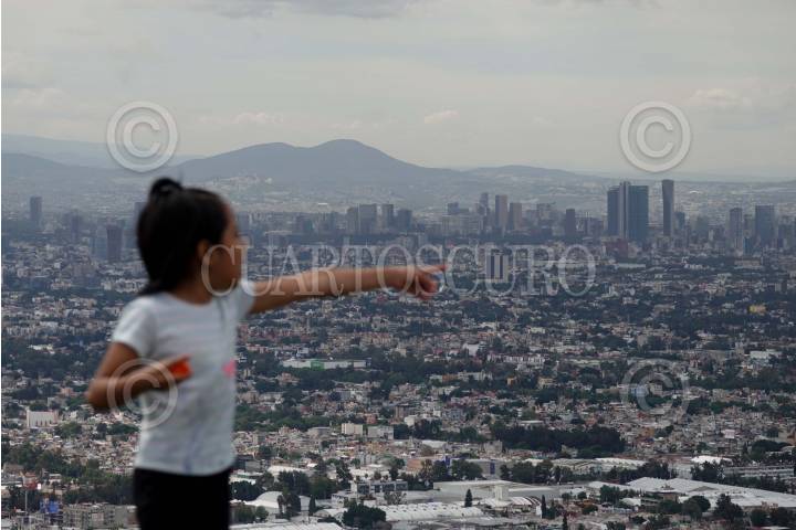 CIUDAD DE MÉXICO, 20AGOSTO2024.- El Sistema de Monitoreo Ambiental informó que la calidad de aire en la capital es Aceptable. En la imagen, una niña señala los edificios que se observan desde la pirámide del Fuego Nuevo en el Cerro de la Estrella. FOTO: GRACIELA LÓPEZ /CUARTOSCURO.COM