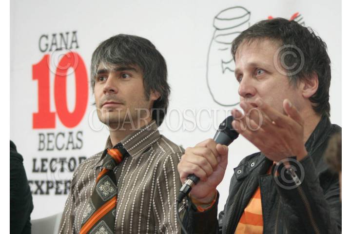 MEXICO, D.F., 24AGOSTO2007.-Xavier Velazco ,grupo Motel y Daniel Gutierrez vocalista del grupo la Gusana Ciega, promueven el proyecto de becas llamado "Te pagan por Leer", organizado por la editorial Alfaguara. FOTO:TANIA CAMACHO/CUARTOSCURO.COM