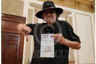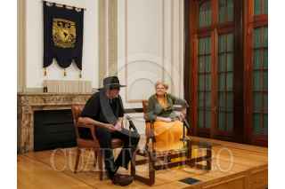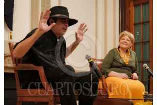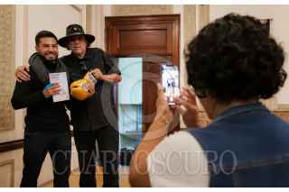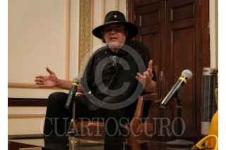 CIUDAD DE MÉXICO, 21AGOSTO2024.- Guillermo Fadanelli posó para una foto con uno de sus lectores con su libro “Desorden. Crítica de la desaparición pura” durante su presentación en la Casa Universitaria del Libro de la UNAM (CASUL). El autor señala que esta nueva obra le permitió combinar combina novela, crónica y ensayo, en donde cuestiona conceptos como la ética, la libertad, y la “vagancia filosófica”. FOTO: ALICE MORITZ/CUARTOSCURO.COM