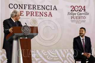 CIUDAD DE MÉXICO, 22AGOSTO2024.-Andrés Manuel López Obrador, presidente de México y el jefe del Gobierno de la Ciudad, Martí Batres Guadarrama; encabezaron la conferencia de prensa esta mañana en el salon Postal del Palacio Nacional. En la que dieron a conocer los pormenores del Tren El Insurgente, que será de Lerma Estado de México a Santa Fé en Ciudad de México. FOTO: GOBIERNO DE LA CIUDAD/CUARTOSCURO.COM