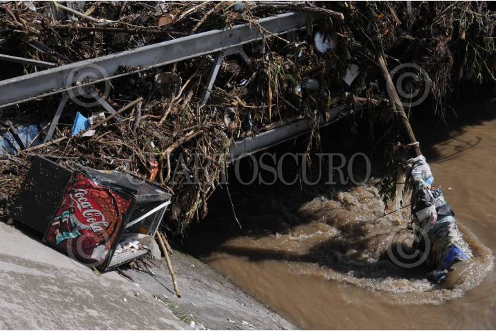 NAUCALPAN, EDOMEX, 22AGOSTO2024. - Un refrigerador y un poste de luz yacen en uno de los puentes por los que cruza el Río Hondo, el cual tuvo un aumento en su flujo o que causó un desbordamiento la noche de ayer. FOTO: DANIEL AUGUSTO /CUARTOSCURO.COM