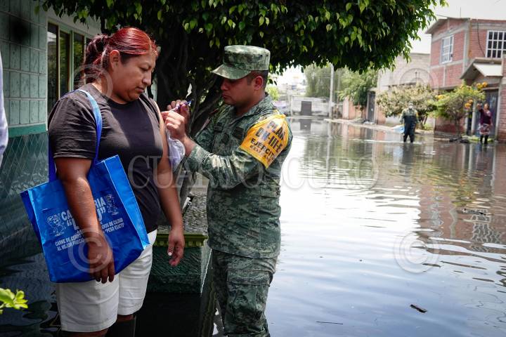 CHALCO, ESTADO DE MÉXICO, 22AGOSTO2024.- Elementos del Ejercito Mexicano han implementado el Plano DN -III-E, en las calles inundandas por aguas negras y pluviales de las colonias Jacalones y Culturas Mexicanas, condición que ya cumple 21 días. Los soldados recorrieron por las casas para entregar víveres, agua, transportar personas que necesitaban salir de sus casas y atención médica, además se han sumado a los trabajos de desazolve. FOTO: ROGELIO MORALES/CUARTOSCURO.COM