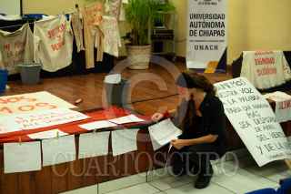 SAN CRISTÓBAL DE LAS CASAS, CHIAPAS, 24AGOSTO2024.- La Colectiva Arte y Acción Feminista, realizo en las instalaciones de la facultad de Ciencias Sociales de la Universidad Autónoma de Chiapas realizaron un performance dirigido a jóvenes estudiantes en contra de la violencia ejercida a las mujeres. FOTO: ISABEL MATEOS /CUARTOSCURO.COM