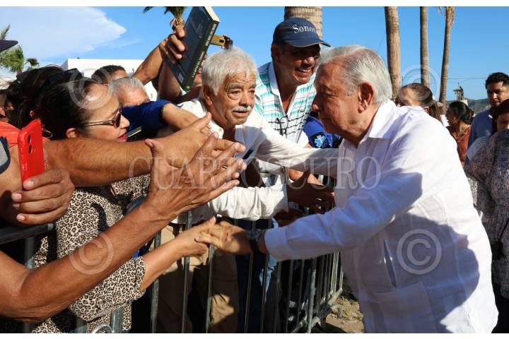 GUAYMAS, SONORA, 24AGOSTO2024.- Andrés Manuel López Obrador, presidente de México, saluda a simpatizantes durante el evento de administración del Sistema Portuario Nacional – Guaymas e inauguración de obras en la Plaza de los Tres Presidentes. Fue acompañado por: Víctor Manuel Ozuna Díaz, director general de Fomento y Administración Portuaria; Juan Pablo de Botton Falcón, subsecretario de Egresos de la Secretaría de Hacienda y Crédito Público; Alfonso Durazo, gobernador de Sonora; José Rafael Ojeda, secretario de Marina; José Daniel Reséndiz, comandante de la VI Región Naval; Rogelio Bello Aguilar, director general de la ASIPONA Guaymas y Karla Córdova González, presidenta municipal de Guaymas. FOTO: PRESIDENCIA/CUARTOSCURO.COM