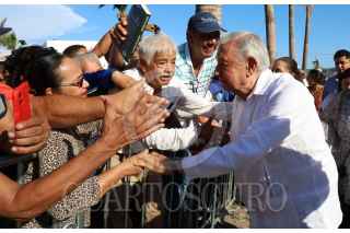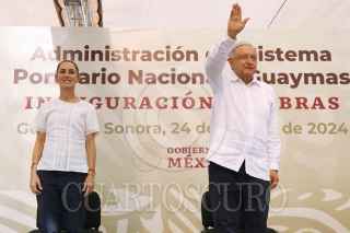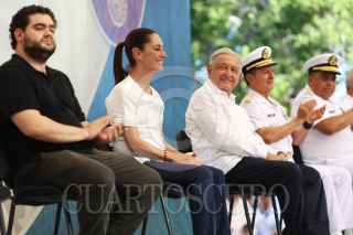 GUAYMAS, SONORA, 24AGOSTO2024.- Juan Pablo de Botton Falcón, subsecretario de Egresos de la Secretaría de Hacienda y Crédito; Claudia Sheinbaum Pardo, presidenta electa de México; Andrés Manuel López Obrador, presidente de México, y José Rafael Ojeda, secretario de Marina, encabezaron el evento de administración del Sistema Portuario Nacional – Guaymas e inauguración de obras en la Plaza de los Tres Presidentes. FOTO: PRESIDENCIA/CUARTOSCURO.COM