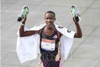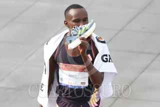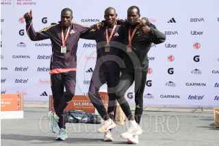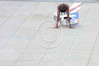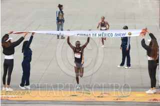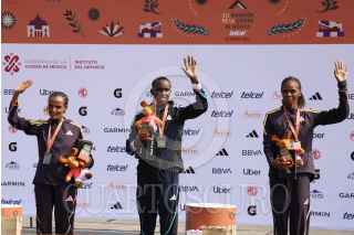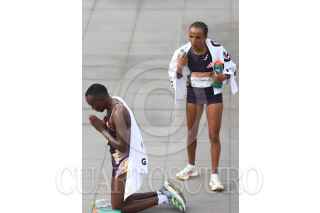 CIUDAD DE MÉXICO, 25AGOSTO2024.- El primer y segundo lugar femenil del Maratón de la CDMX, Fancy Chemutai y Shitaye Hatbe, rezan y descansan luego de terminar los 42 km del evento. FOTO: DANIEL AUGUSTO/ CUARTOSCURO.COM