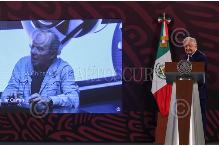 CIUDAD DE MÉXICO, 26AGOSTO2024.- Andrés Manuel López Obrador, Presidente de México, encabezó su tradicional mañaneras en Palacio Nacional. El Ejecutivo habló sobre las declaraciones de Tomas Zerón en torno al caso de la desaparición de los 43 normalistas de Ayotzinapa. Además mostró mensajes de Héctor Aguilar Camino, Enrique Krauze, en donde afirman que México regresara a una monarquía, esto a la recién aprobación por parte del INE de las mayorias en las Cámaras de Diputados y Senado, las cuales encabeza Morena. FOTO: MOISÉS PABLO/CUARTOSCURO.COM