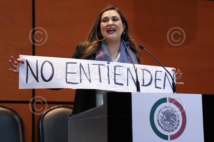 CIUDAD DE MÉXICO, 26AGOSTO2024.- Cynthia López Castro, diputada del PRI, muestra una manta con la leyenda "No Entienden", durante la discusión de la Reforma Judicial. FOTO: DANIEL AUGUSTO/ CUARTOSCURO.COM