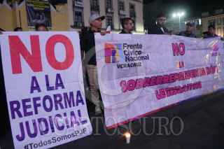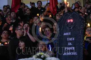 XALAPA, VERACRUZ, 27AGOSTO2024.- Trabajadores del Poder Judicial en Veracruz realizaron una velada de protesta en contra de la reforma al Poder Judicial de la Federación que esta siendo impulsada por el Jefe de Ejecutivo y la cual ya se aprobó en comisiones en la Cámara de Diputados. Los inconformes llevaron veladores y una ataúd en referencia a que si esta se aprueba en los términos en la que esta propuesta la independencia de este poder significa su muerte. la concentración se realizó en la Plaza Lerdo. FOTO: YERANIA ROLÓN/CUARTOSCURO.COM