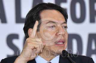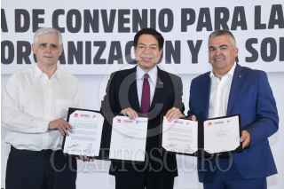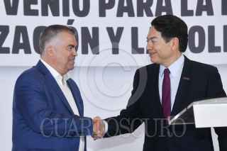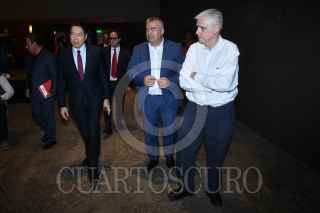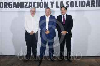 CIUDAD DE MÉXICO, 28AGOSTO2024.- Mario Delgado, dirigente nacional de Morena, acompañado de Rafael Barajas "El Fisgón" y Santos Cerdán, miembro del Partido Socialista Obrero Español (PSOE), al finalizar la firma de convenio de colaboración entre ambos partidos denominado "La formación, la organización y la solidaridad", evento realizado en un hotel de la colonia Juárez. FOTO: MARIO JASSO/CUARTOSCURO.COM