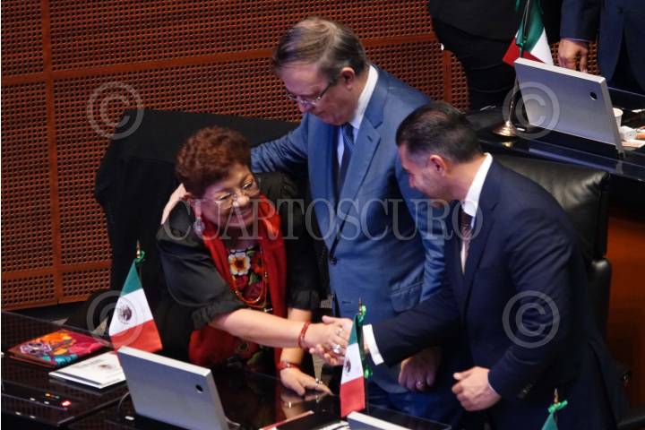 CIUDAD DE MÉXICO, 29AGOSTO2024.- Los senadores electos Ernestina Godoy, Marcelo Ebrard y Omar García Harfuch se saludaron durante la Sesión Constitutiva del Senado de la República. FOTO: GRACIELA LÓPEZ /CUARTOSCURO.COM