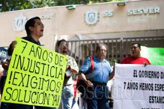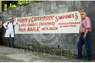 XALAPA, VERACRUZ. 29AGOSTO2024.- Con pancartas y megáfonos, extrabajadores del Seguro Popular reclaman pagos prometidos desde la administración de Yunes. FOTO: YERANIA ROLÓN/CUARTOSCURO.COM
