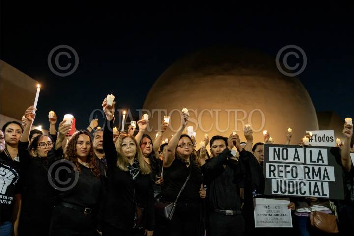 TIJUANA, BAJA CALIFORNIA, 30AGOSTO2024.- Una gran multitud de personas, trabajadores del Poder Judicial, acompañados de familiares y amigos, marcharon la tarde del jueves 29 de agosto, en señal de protesta a la reforma judicial, que pretende la elección a través del voto popular de jueces, ministros y magistrados. Los manifestantes, con vestimenta negra a manera de luto, flores y un ataúd con la leyenda “CJTPF descanse en Paz la justicia”, partieron desde las oficinas del Poder Judicial Federal, ubicadas sobre el bulevar Paseo de los Héroes en Zona Río hasta el Centro Cultural de Tijuana (Cecut). De manera silenciosa recorrieron las calles de la Zona Río con veladoras en una manifestación que aseguraron ser totalmente pacífica con el fin mas que exigir, dar a conocer a la sociedad las afectaciones de esta reforma. Alejandro Garcia, secretario del Tribunal, describió a la reforma como un golpe mortal a la justicia mexicana, a la independencia de los poderes, razón por la que el evento llevaba por título “la justicia ha muerto”. Tras llegar al Centro Cultural de Tijuana, Matilde del Carmen González Barbosa, Magistrada de circuito, externo que existe un consenso en torno a la necesidad de reformar el sistema de justicia, pero con un poder judicial independiente. FOTO: OMAR MARTÍNEZ/ CUARTOSCURO.COM