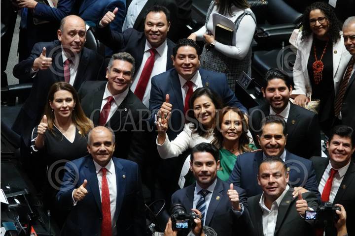 CIUDAD DE MÉXICO, 01SEPTIEMBRE2024.- La bancada priista encabezada por: Alejandro Moreno Cárdenas, Ruben Moreira y Manuel Añorve Baños posan previo a la sesión en que fue entregado el 6to Informe de gobierno del presidente Andrés Manuel López Obrador, así como la instalación de la LXVI Legislatura. FOTO: GALO CAÑAS/CUARTOSCURO.COM