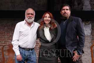 CIUDAD DE MÉXICO, 04SEPTIEMBRE2024.- Enrique Signer, actor y director de Réquiem de Reynolds Robledo, acompañado de Mónica Huarte y Alberto Estrella, se tomaron una fotografía al término de durante un conferencia de prensa en el Círculo Teatral, en la que anunciaron la puesta de escena del 8 al 29 de septiembre en el Foro Shakespeare. FOTO: GRACIELA LÓPEZ /CUARTOSCURO.COM